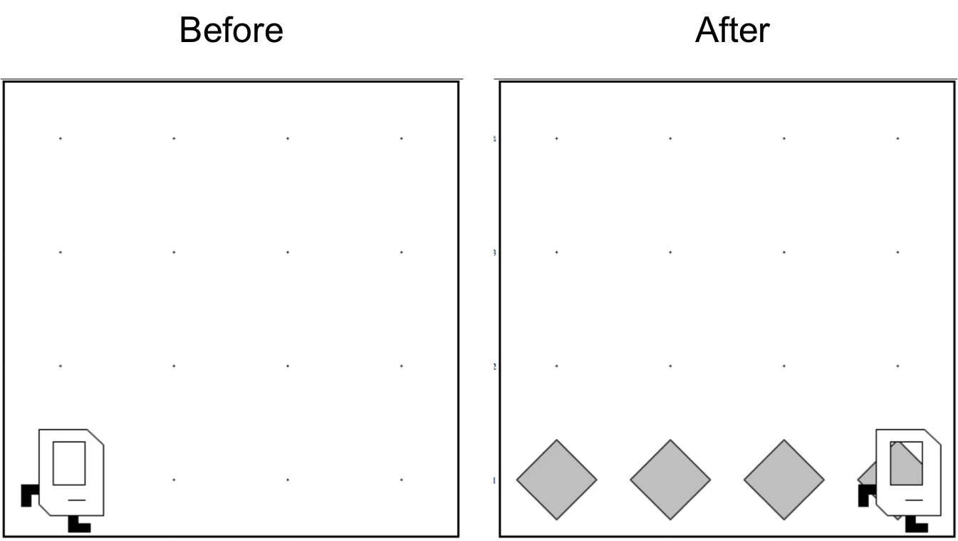 Your goal is to fill the first row of Karel's world with beepers. You can assume that Karel starts in the bottom left corner, facing east. For example, if you ran your program on the world on the left, it should produce the world on the right.