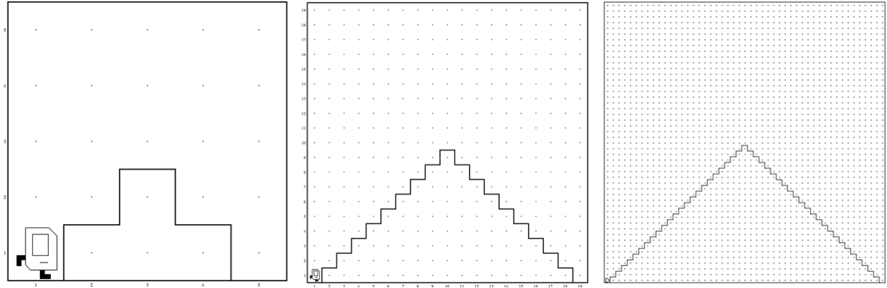 Unlike the previous problems, you are not garunteed the height of the mountain before hand. The program you write should allow Karel to climb mountains of any size. For example the following three: